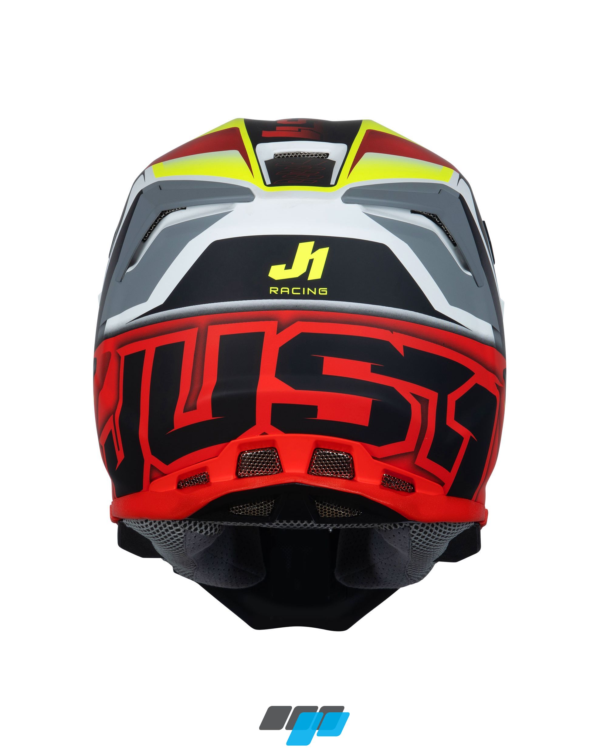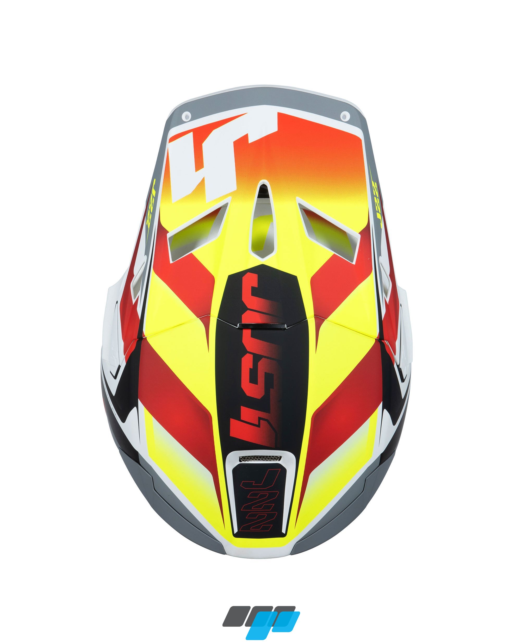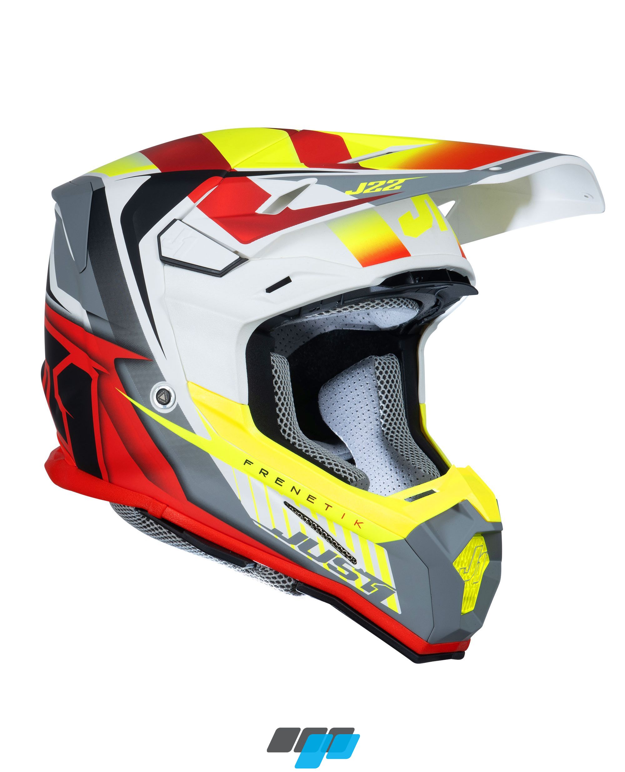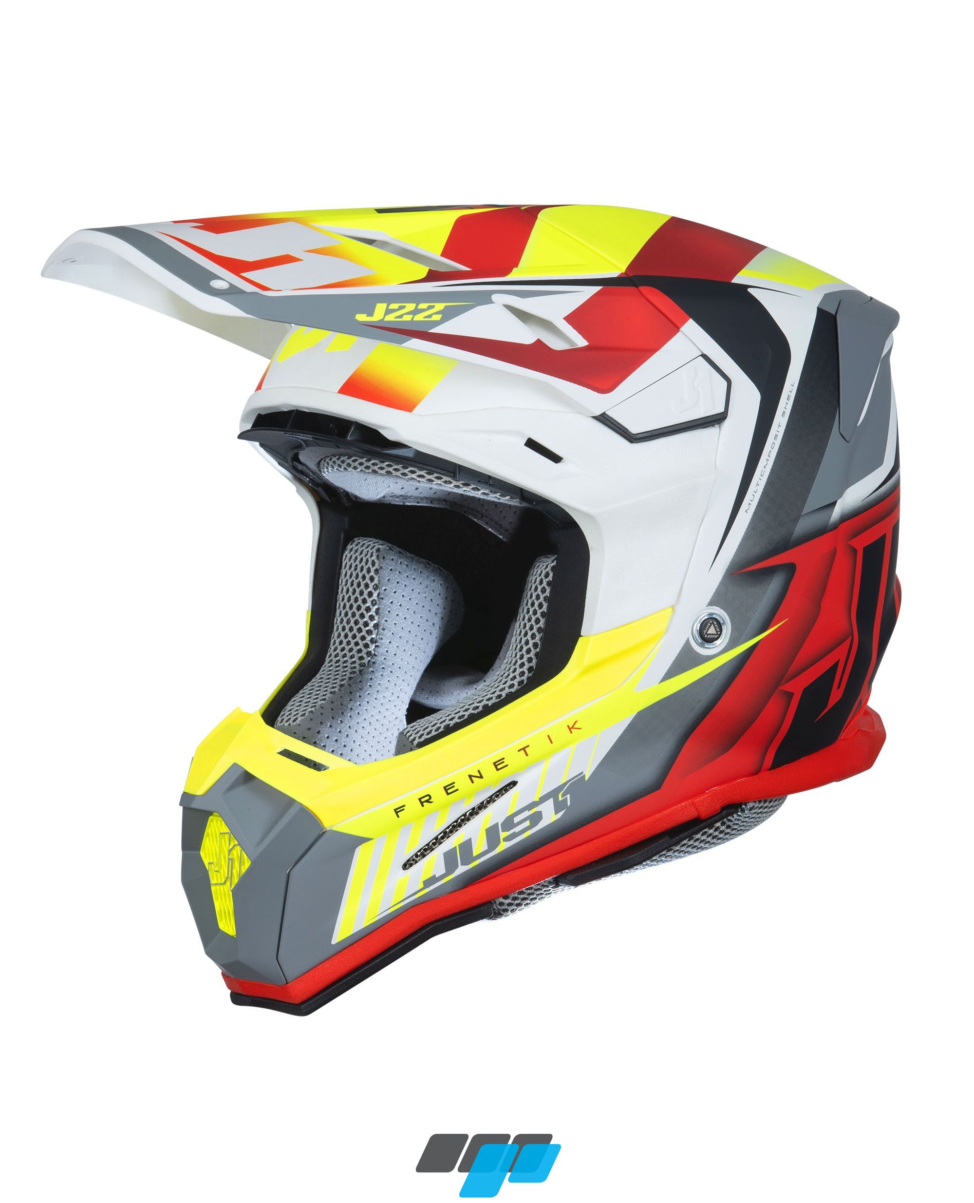Just1 motorcross Fibreglass crash helmet J22 Frenetik in fire fluorescent yellow, and white colour scheme with high rigidity shell anatomically structured with the exclusive "N.B.F.F." system (Neck Brace Front Fit). Removable and washable inner lining, using highly breathable fabrics and hygienically treated