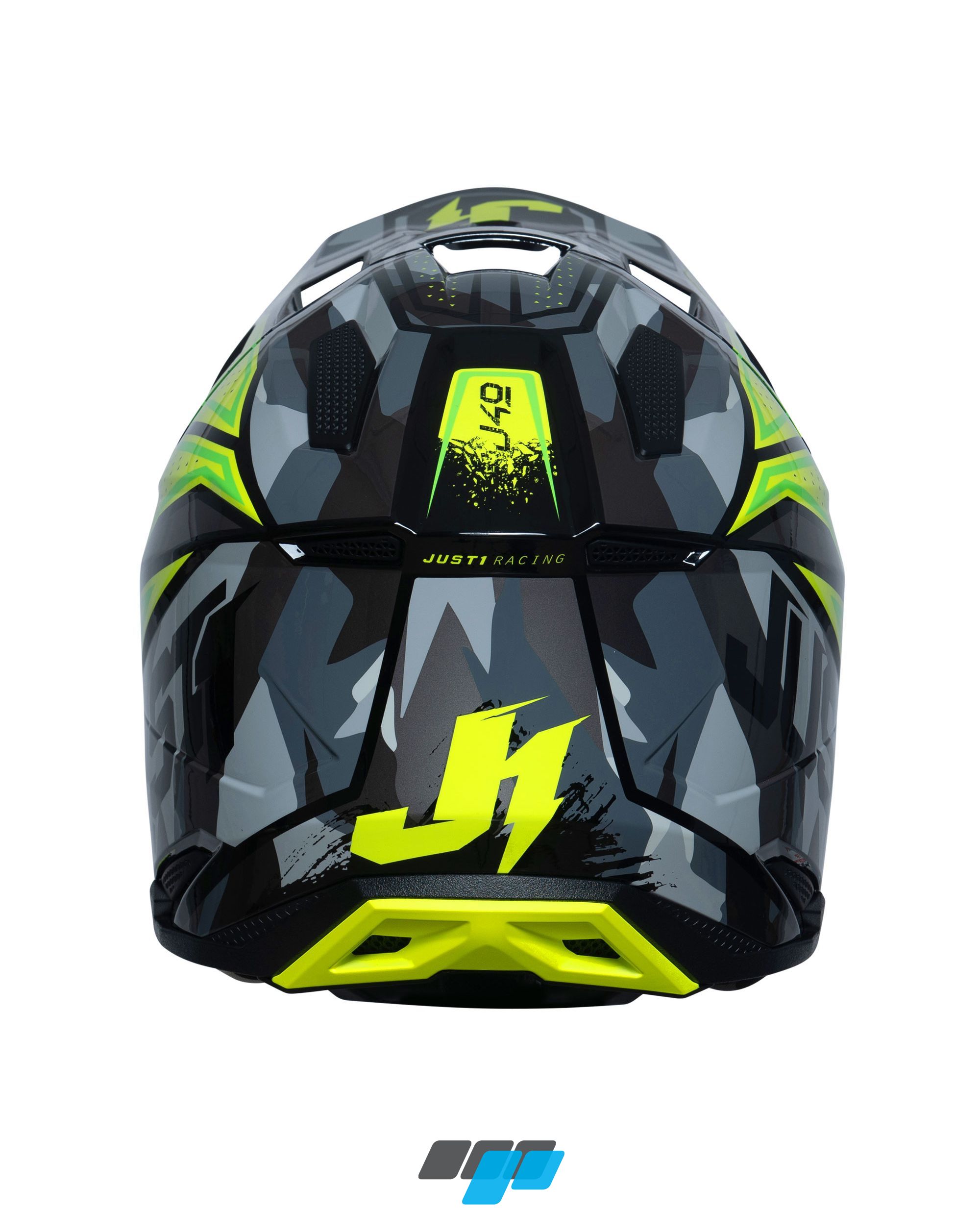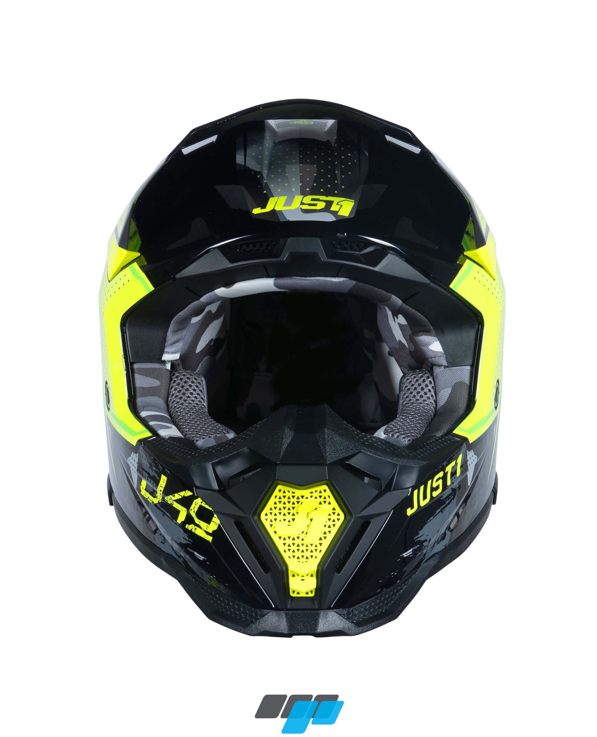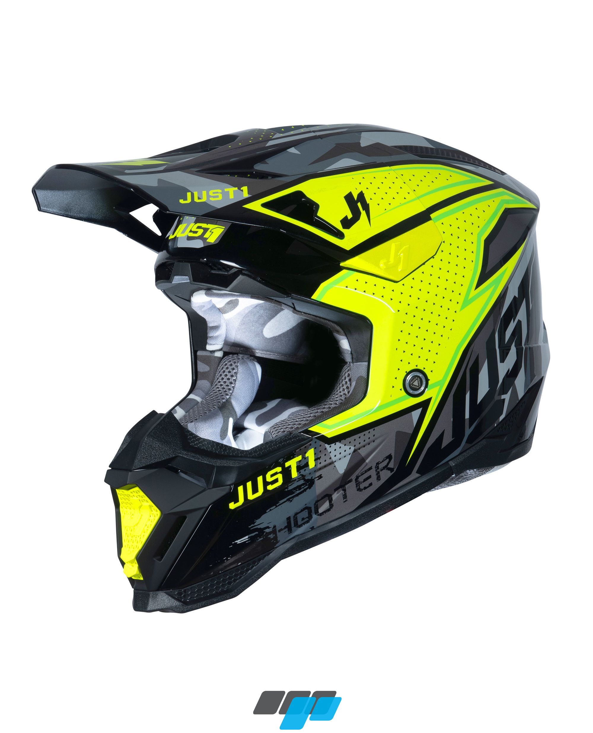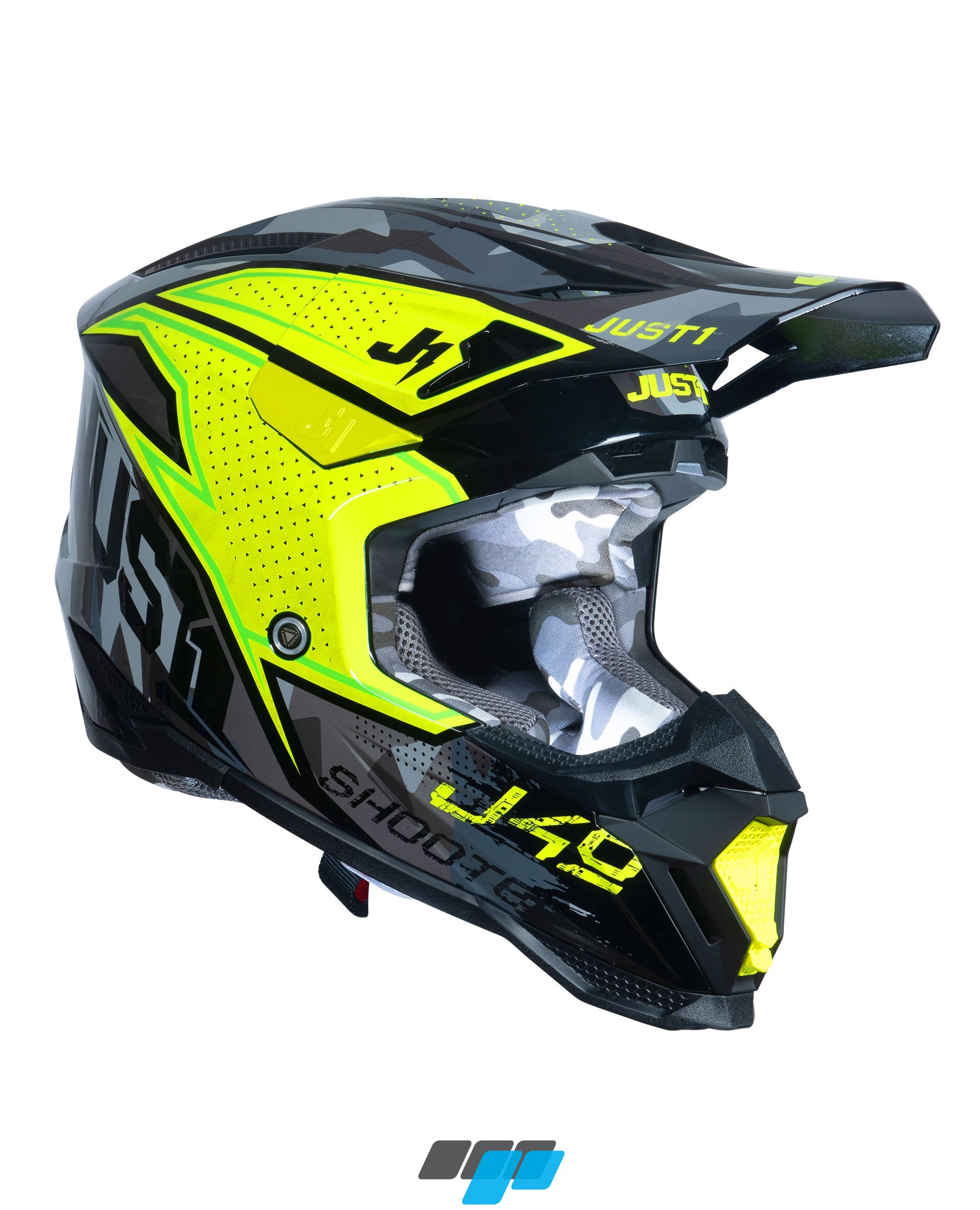 The Just1 J40 motorcross ABS shell crash helmet in fluorescent yellow, camo and black graphics and interior lining, is the result of this important research, a study aimed at improving technical features to help ensure the safety and comfort of the rider during competition. Featuring new inner lining fitting for a improved comfort and new peak release system
