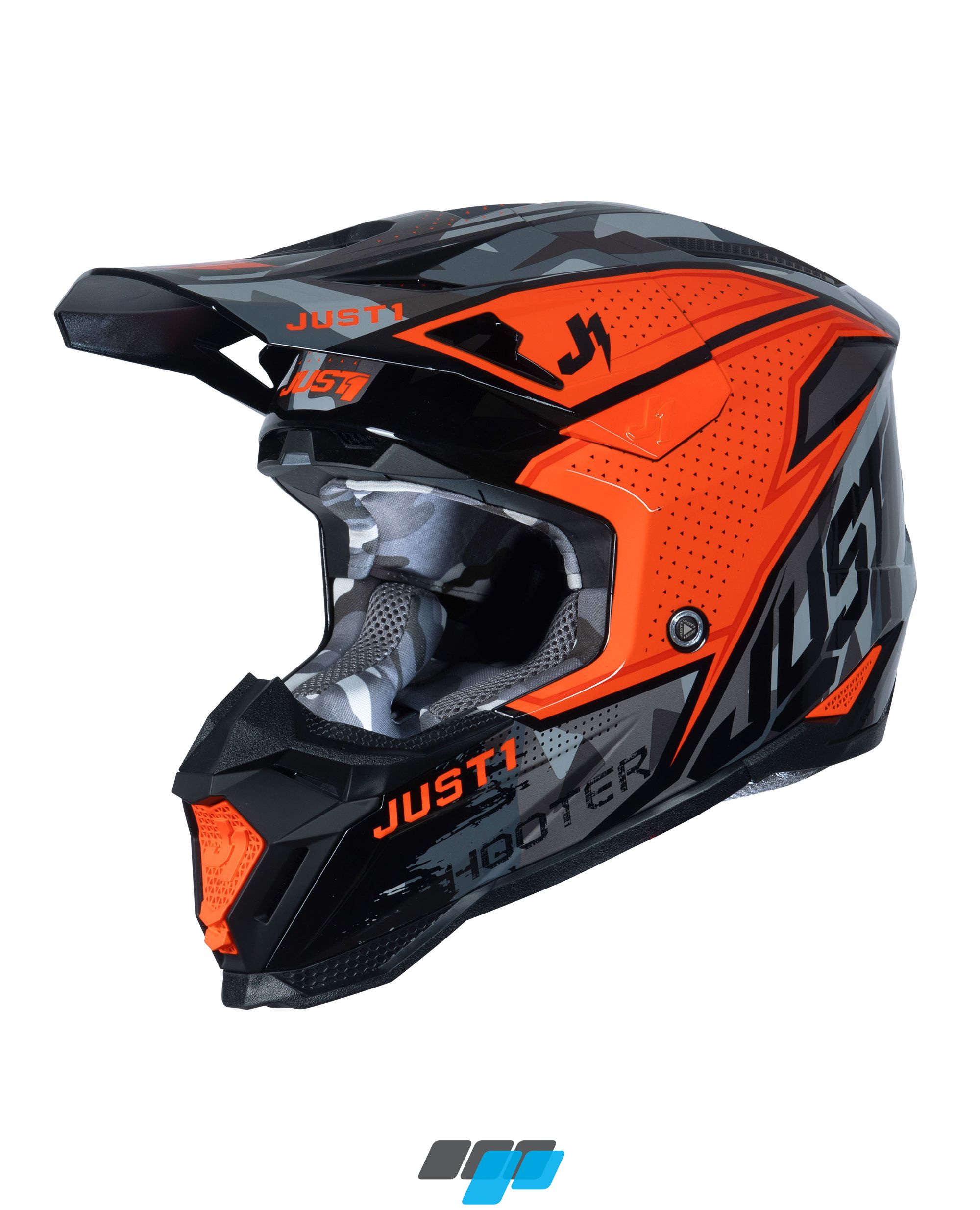 The Just1 J40 motorcross ABS shell crash helmet in fluorescent orange, camo and grey graphics and interior lining, is the result of this important research, a study aimed at improving technical features to help ensure the safety and comfort of the rider during competition. Featuring new inner lining fitting for a improved comfort and new peak release system