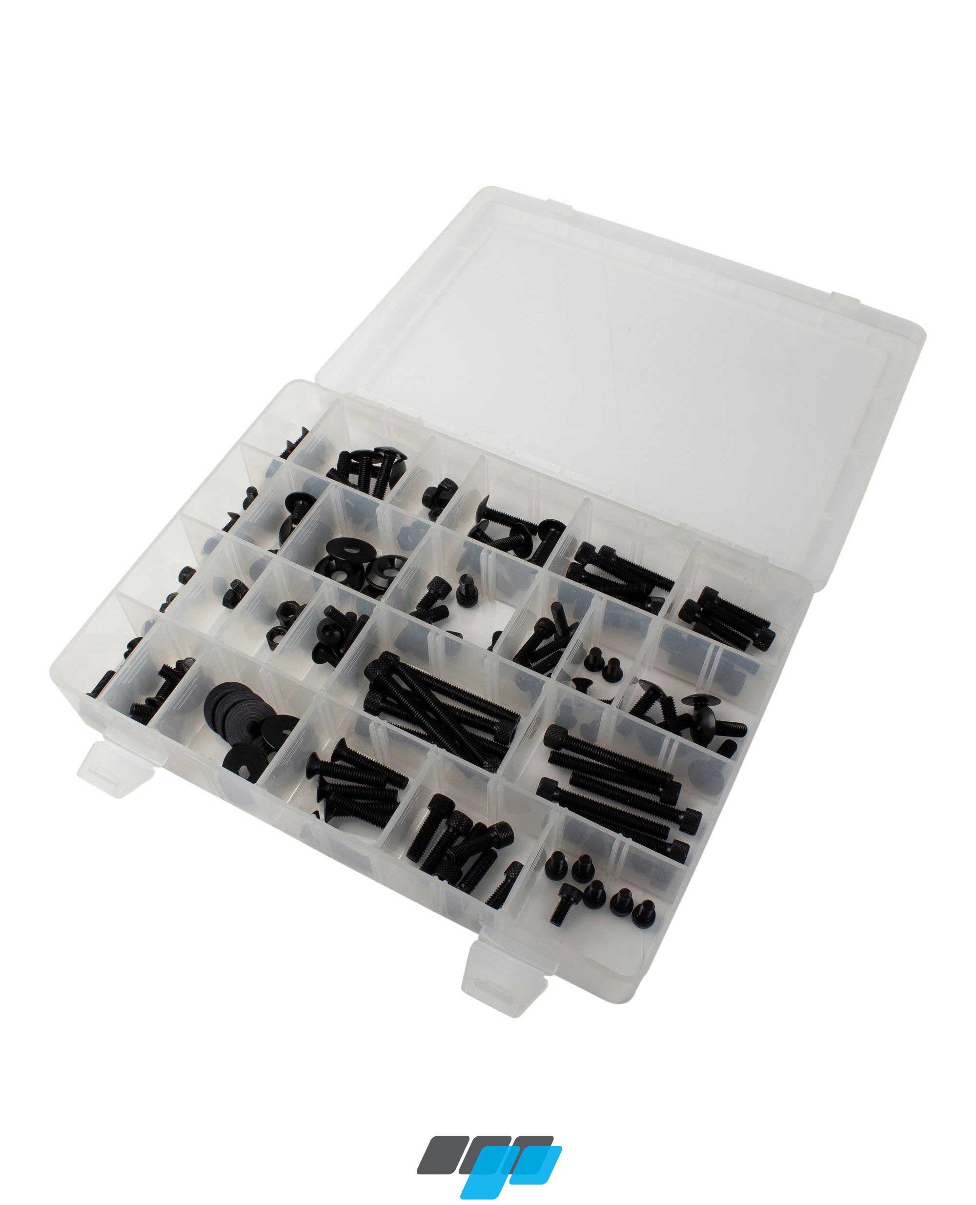 Universal screw kits include 150 anodised alloy screws, nuts & washers in M5, M6 thread sizes, ideal as motorcycle replacement bolts