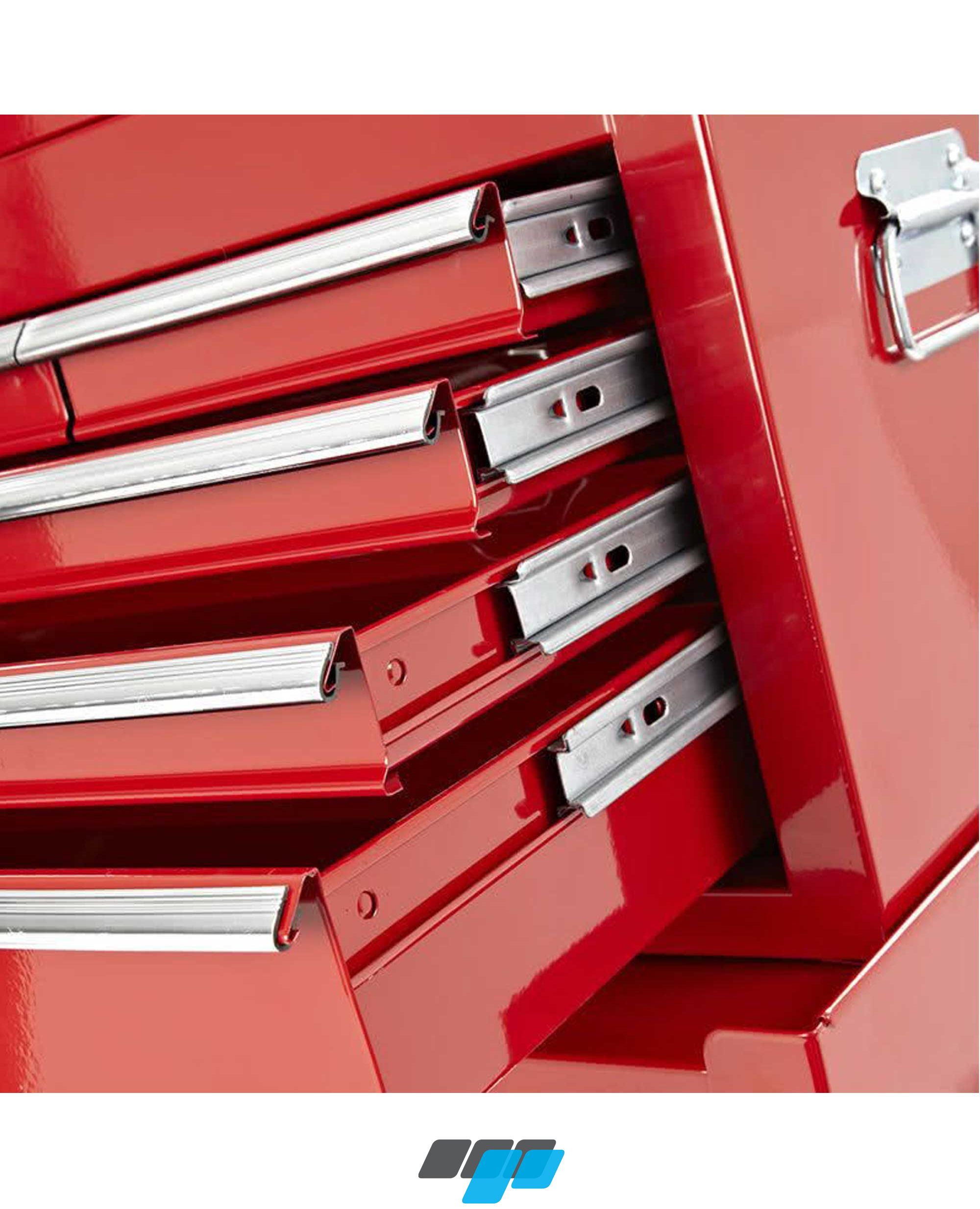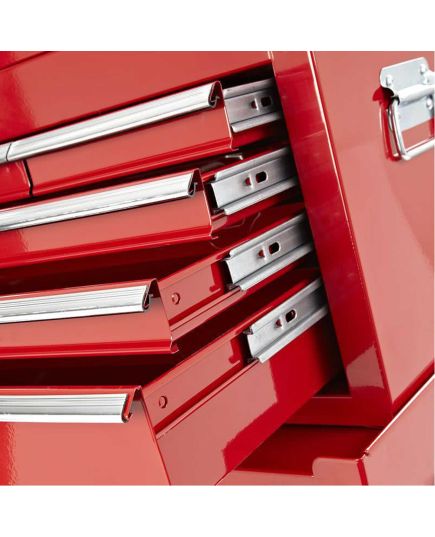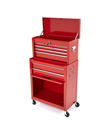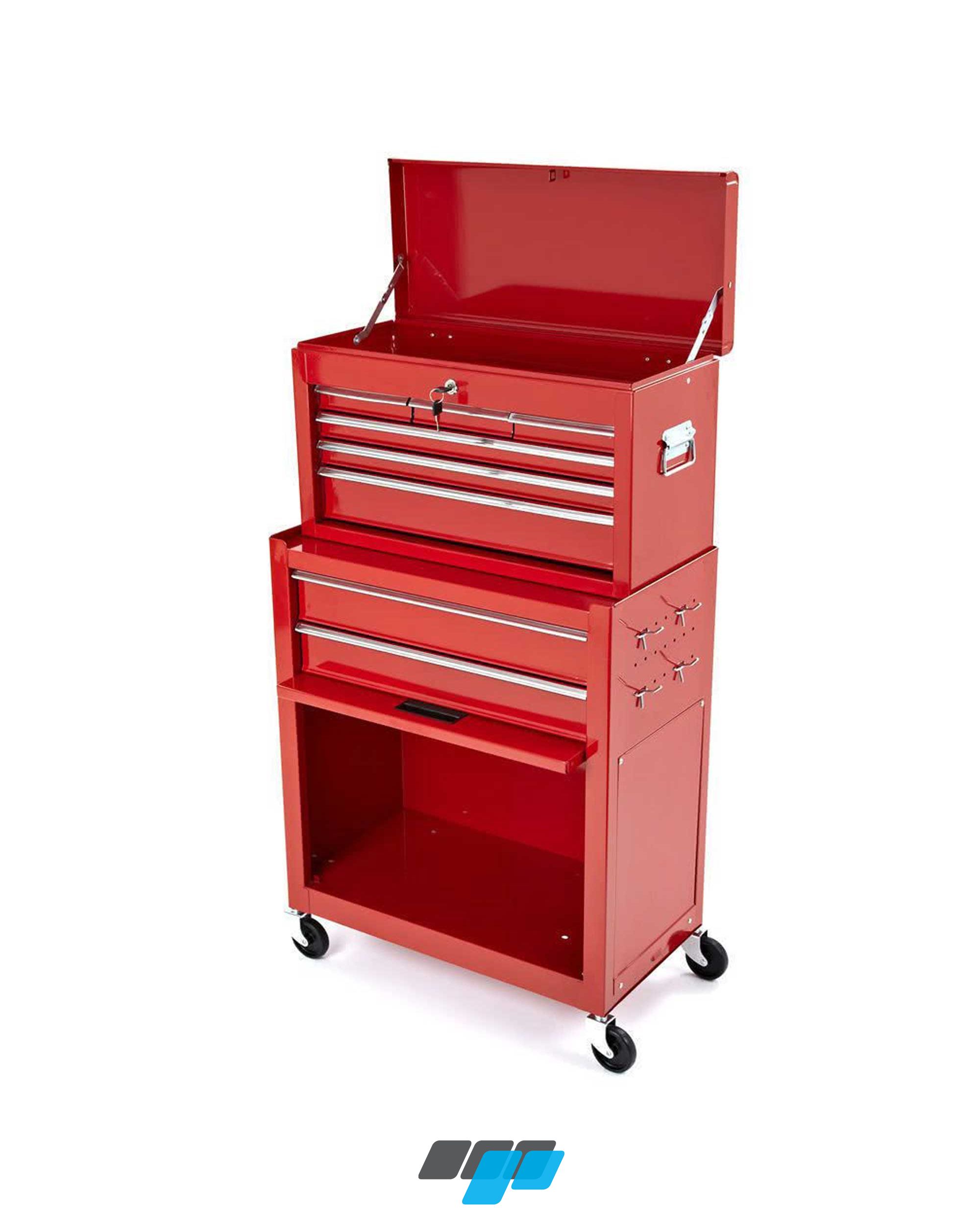 Mechanics steel combination tool chest and cabinet set features a lower base unit with two sliding drawers, large capacity storage compartment and up and over door for neat tool storage, all drawers are lockable including lid section. When tool drawers are not in use can be placed in storage compartment for increased security.