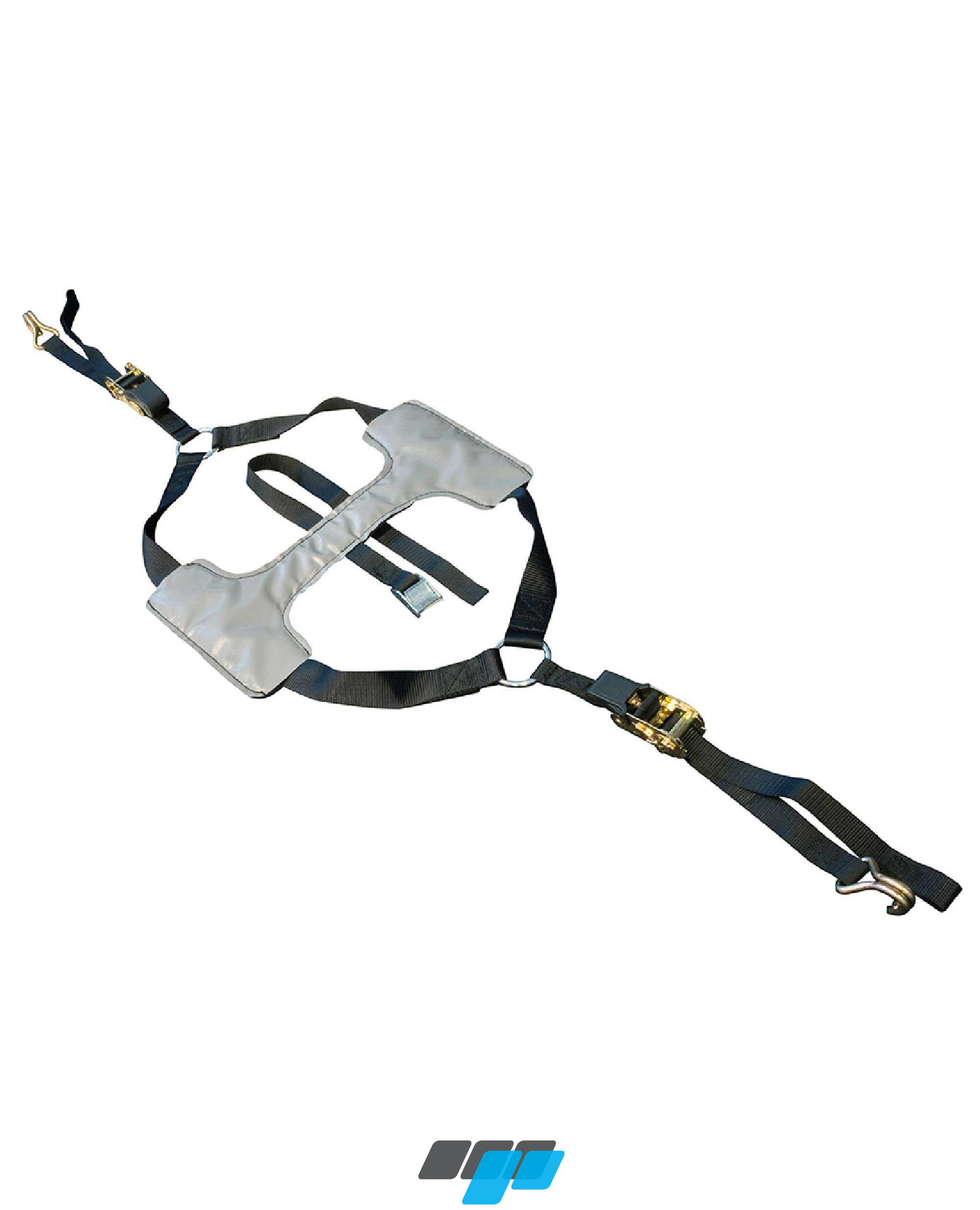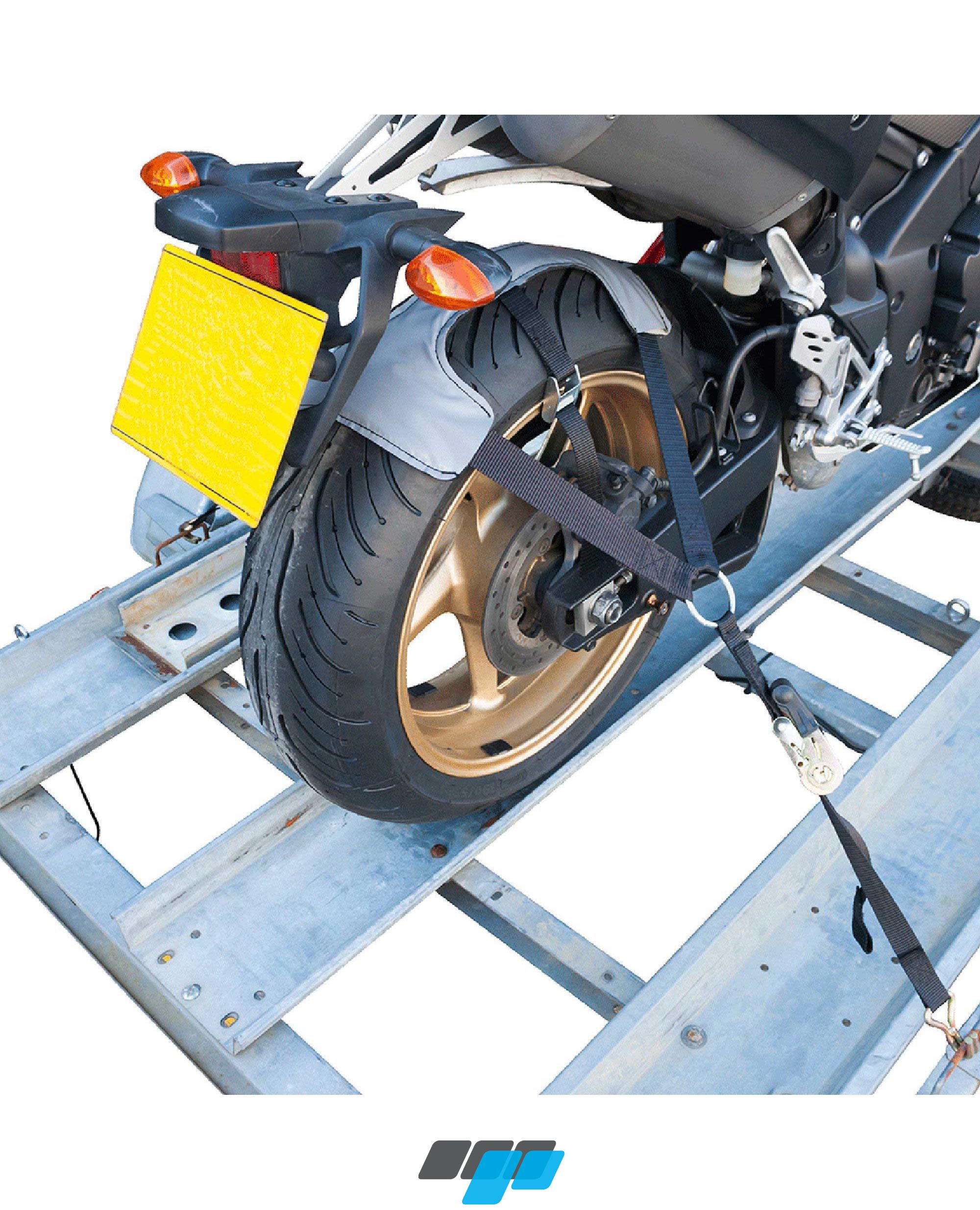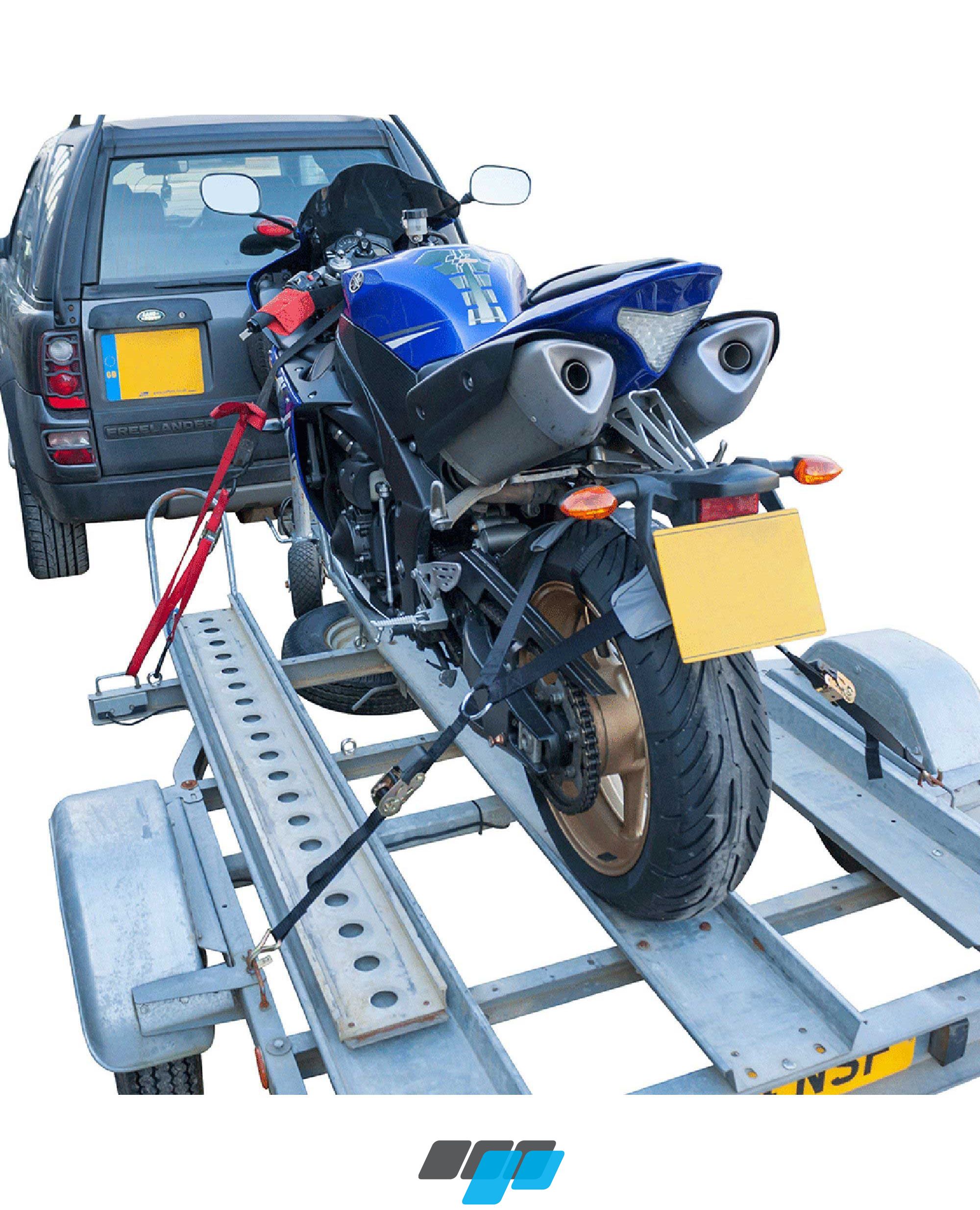 The contoured brace section fits over the wheel with straps either side with integrated ratchet tie-downs to secure the motorcycle in place to trailer, pulling down the suspension eliminating bounce.