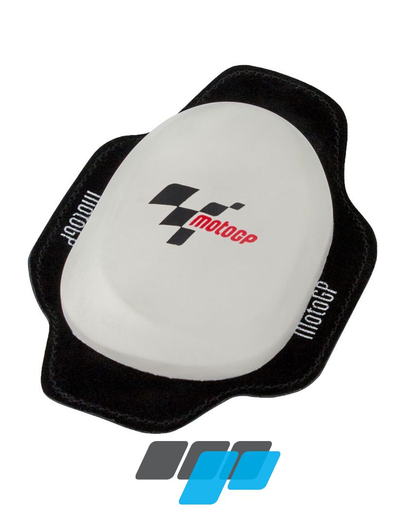 MotoGP knee slider featuring the MotoGP banded logo, fitted with ultra-firm grip Velcro and solid plastic motorcycle knee slider to fit securely to road racing leathers, suitable for use on road or track
